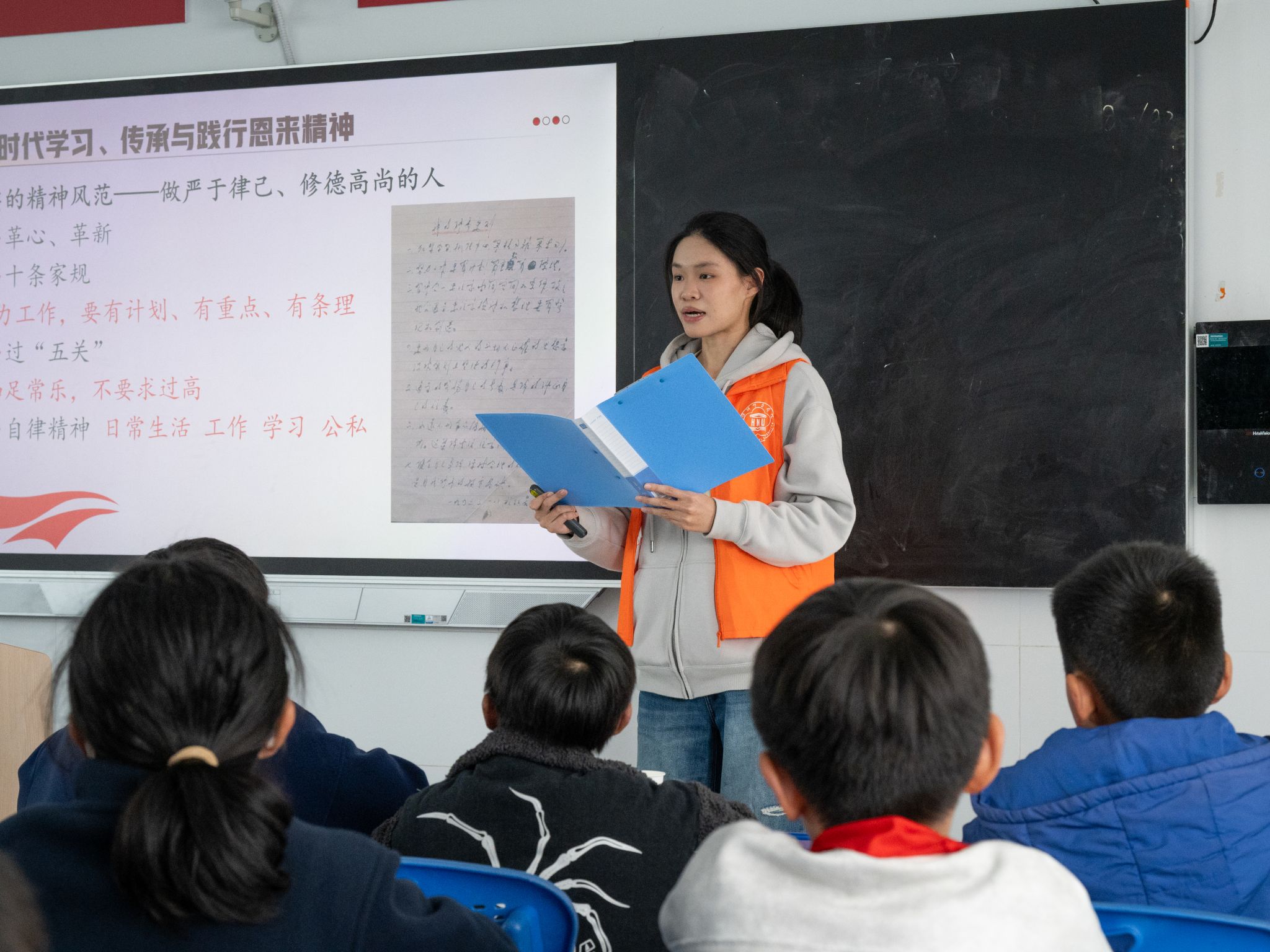 淮师物电学院2304班与淮师附属实验学校四(3)班举行了结对仪式,大学生向小学生赠送了学习周恩来精神风范的书籍,并与小学生一起上了一堂生动的思政课。大学生代表以“海棠花开承初心,恩来精神耀荣光”为主题,声情并茂地讲述了周恩来总理波澜壮阔的一生,介绍了周恩来崇高精神风范;小学生代表分享了作为少先队员如何学习和践行周恩来崇高精神风范。